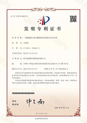 超敏蛋白復(fù)合酶第一項國家發(fā)明專利, 2011年8月申報,2013年獲得授權(quán)。